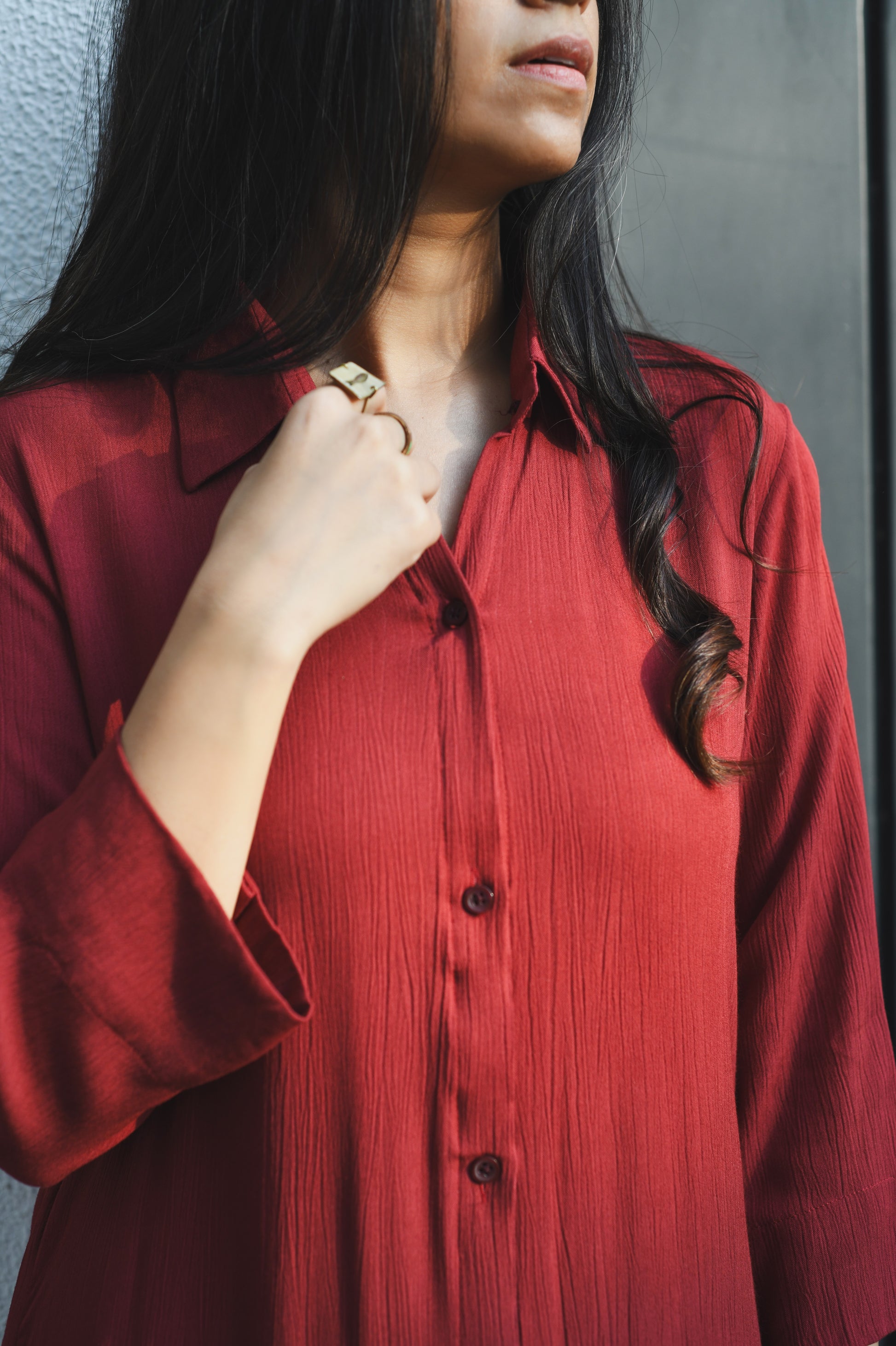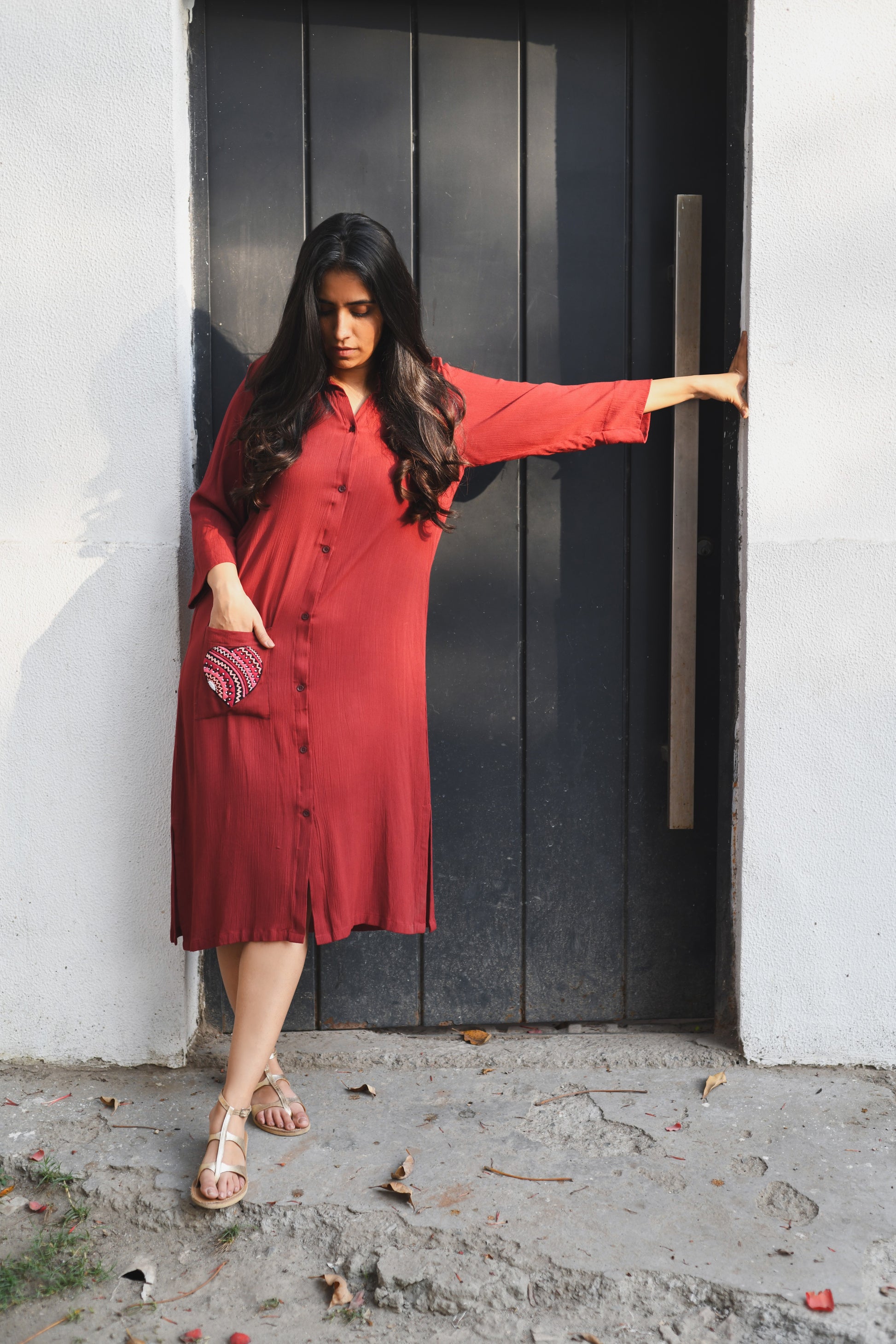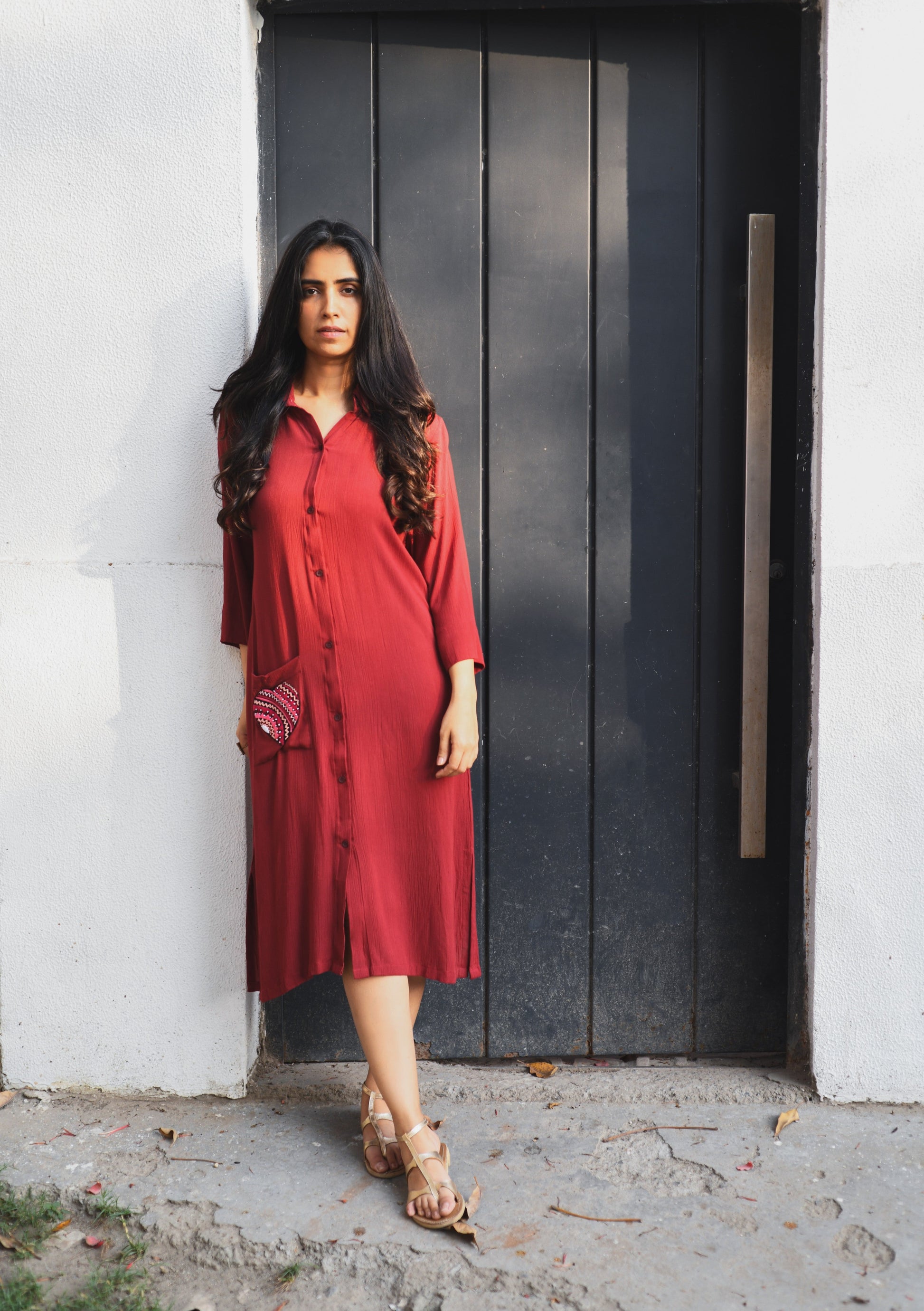 Details and Fit: The shirt dress in dreamy maroon is an absolute must-have for any fashion-forward wardrobe. With its unique hand-embroidered retro heart design, this dress brings a perfect mix of vintage charm and modern style. The deep, rich maroon hue gives it a timeless appeal, while the playful heart embroidery adds a whimsical, romantic touch.