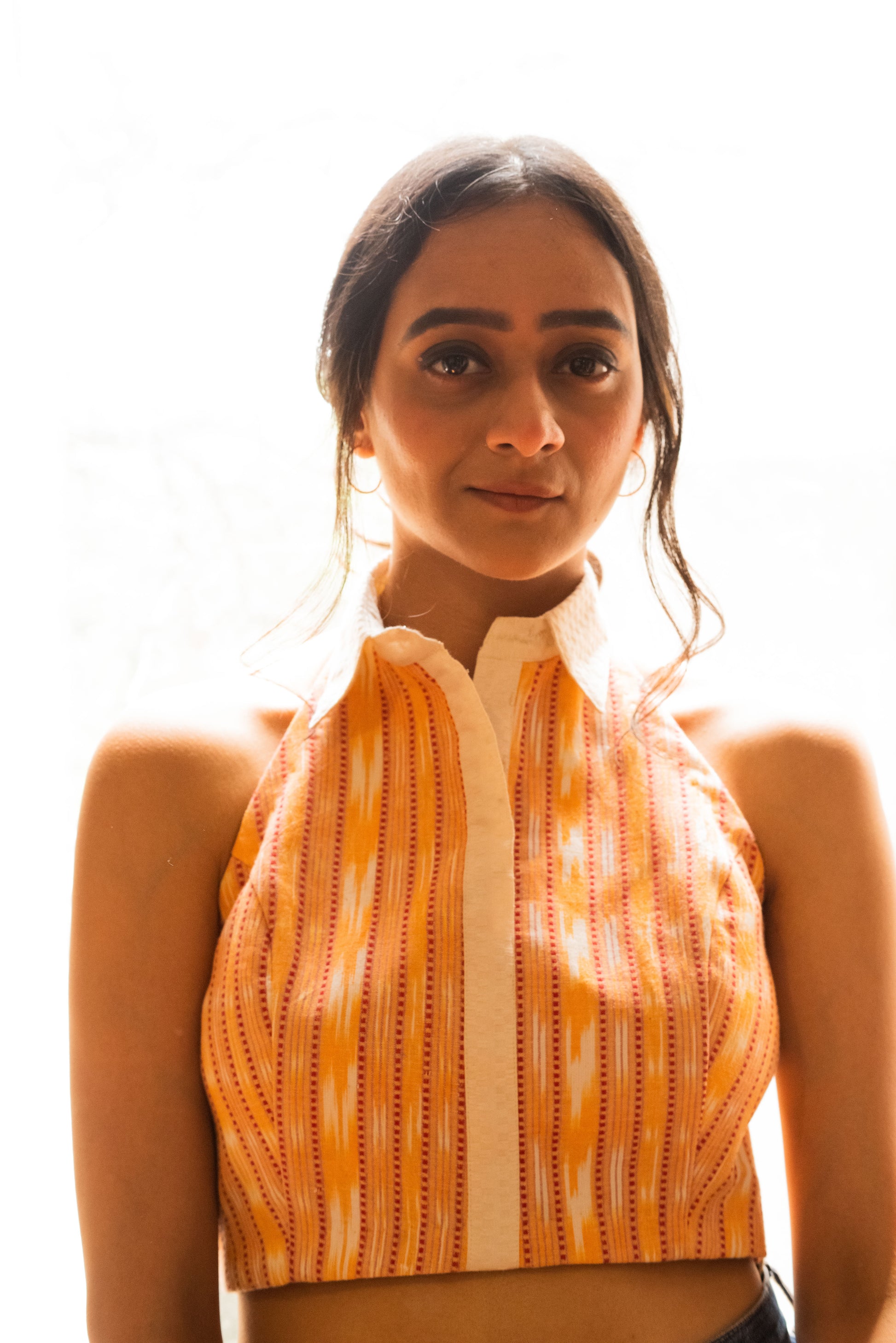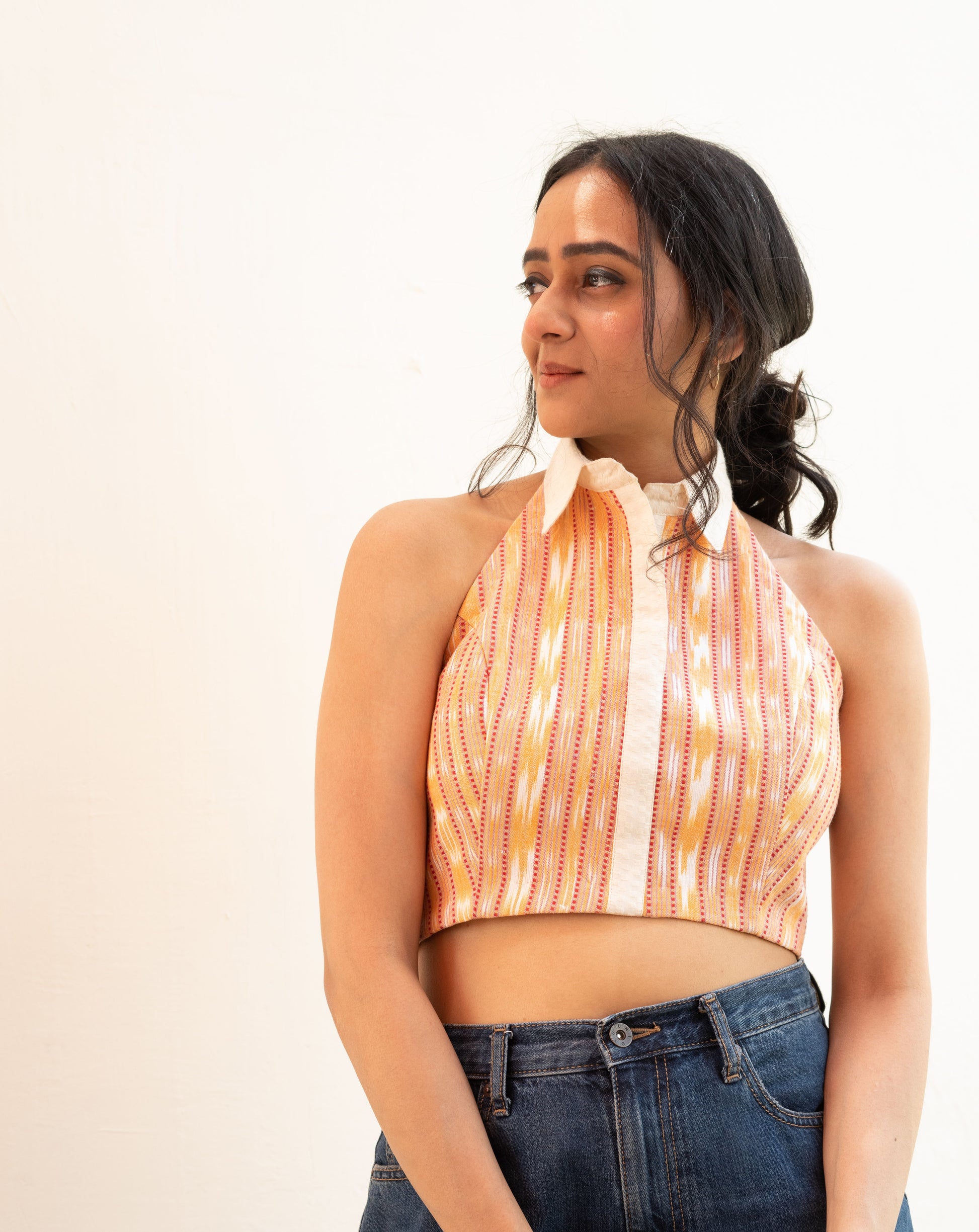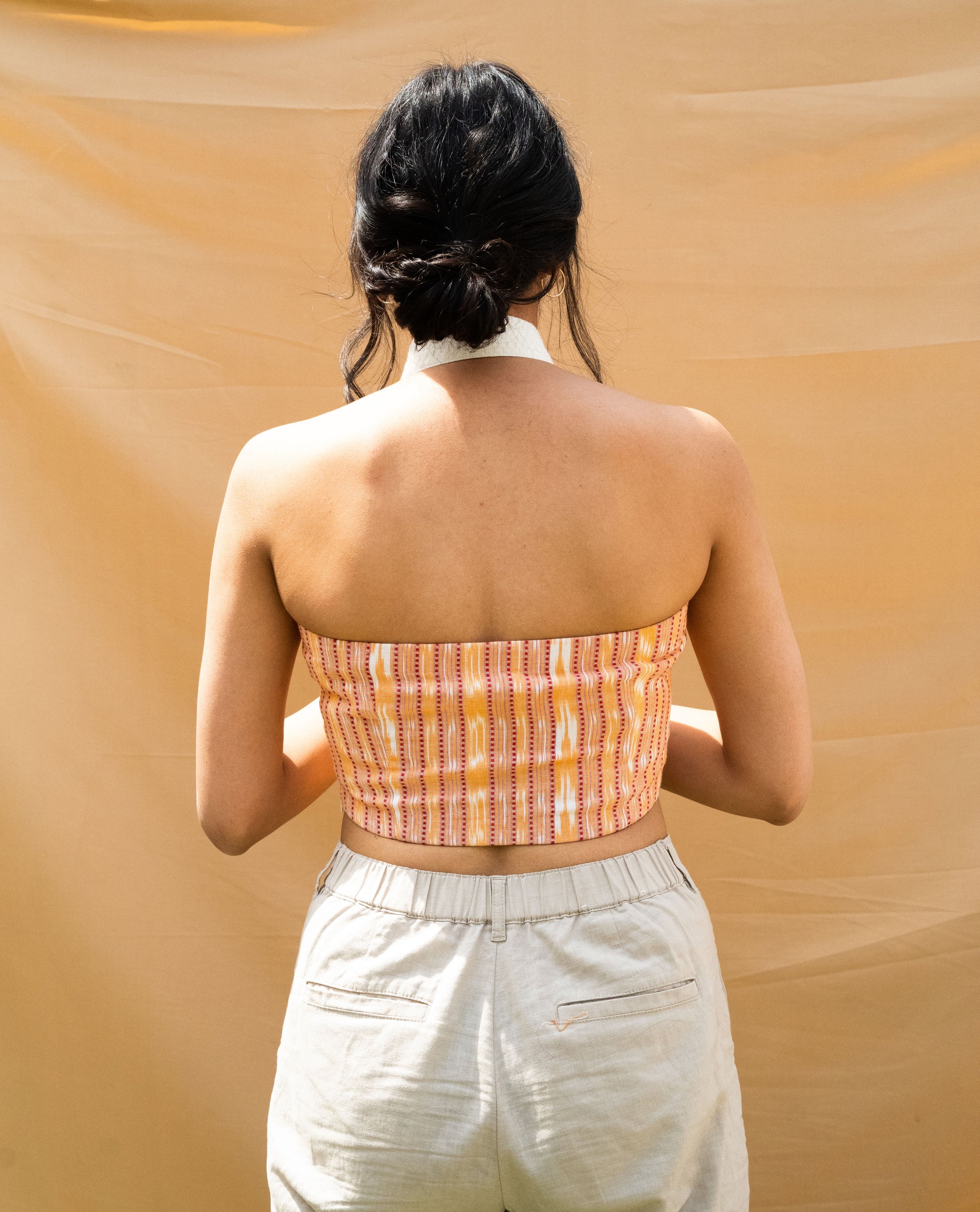 Design: A fusion of unique ikat print and backless shirt patterns.