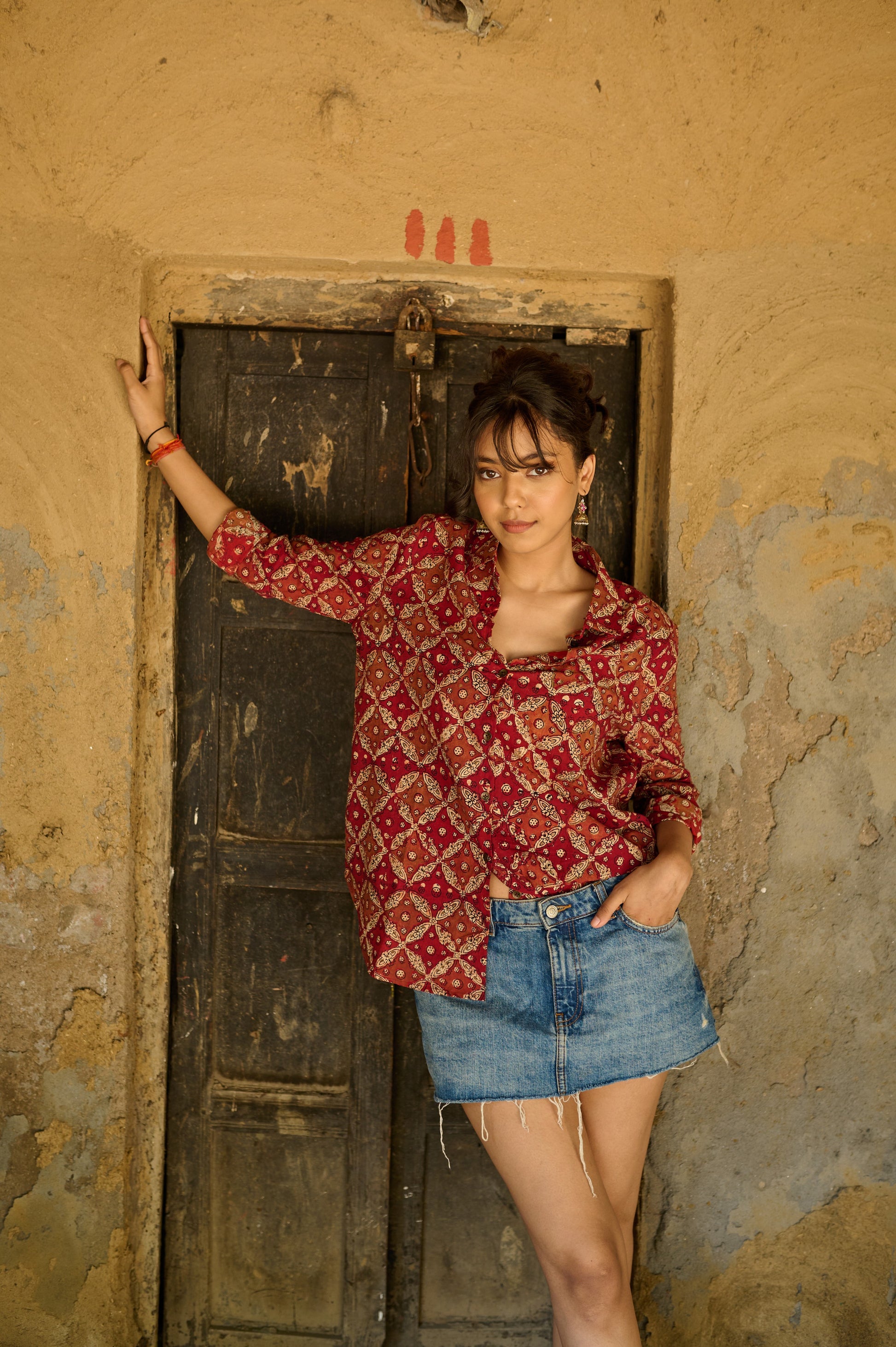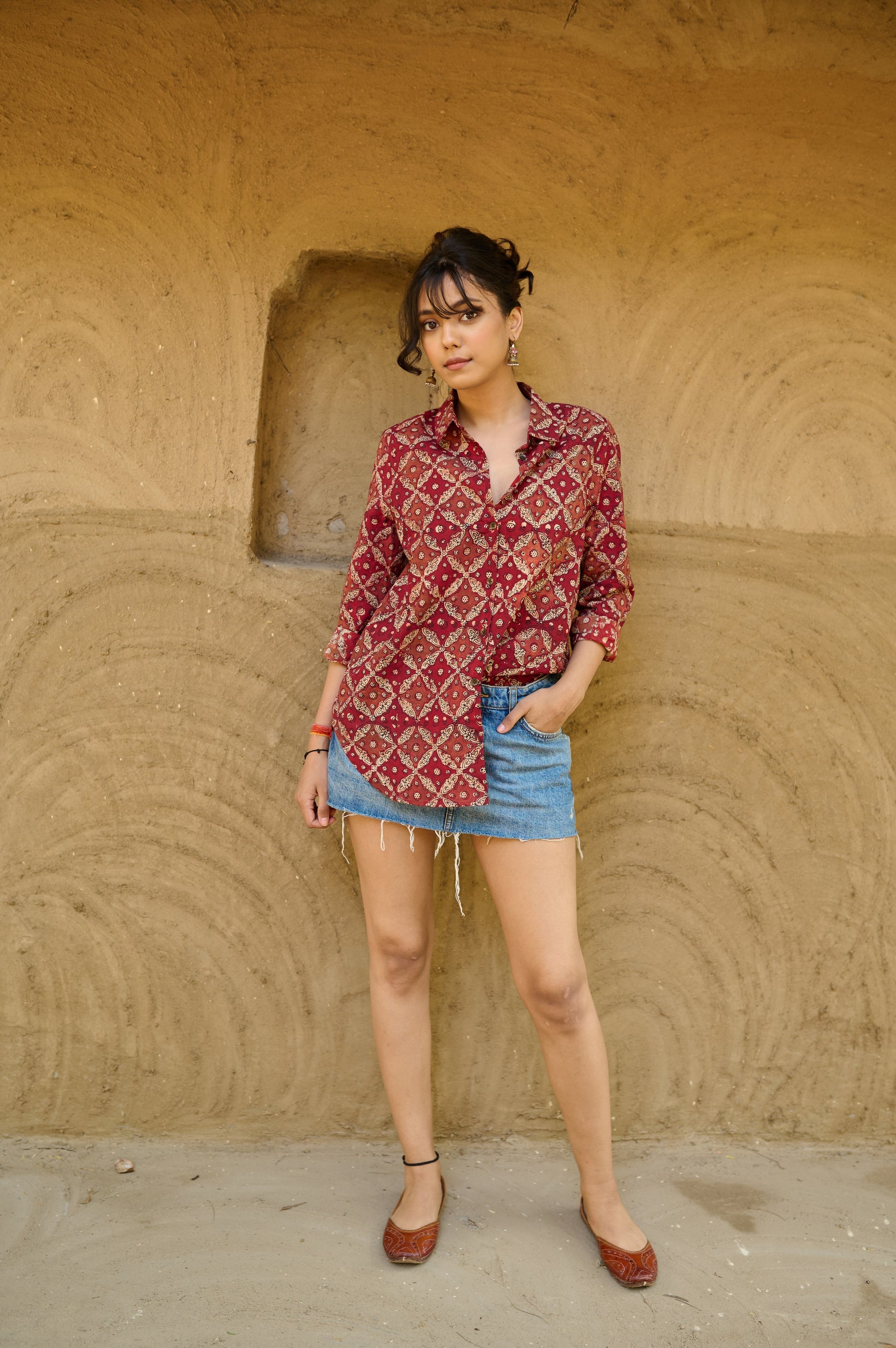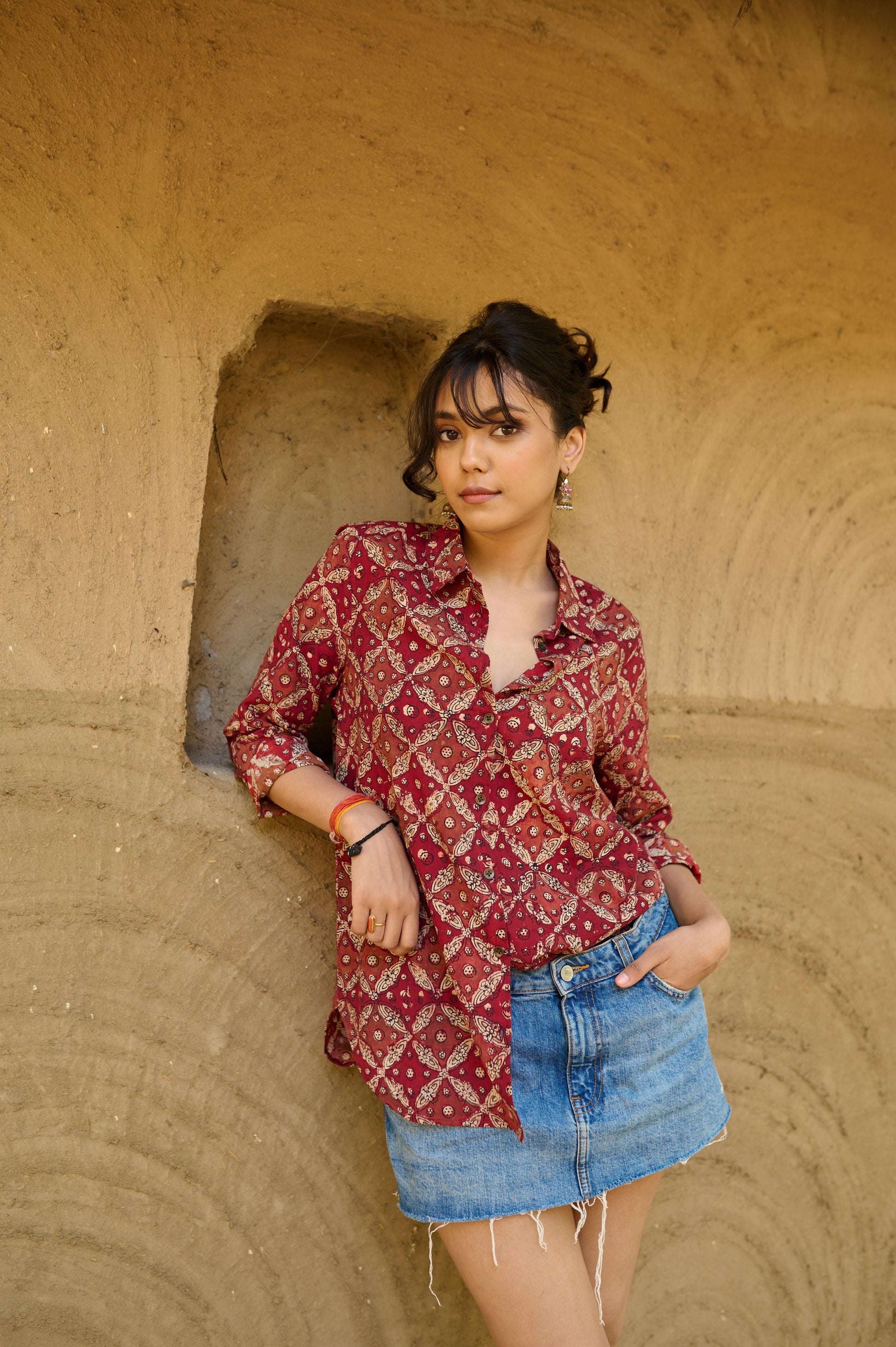 - Hand Block printed shirt in beautiful tones of Maroon, Red and Rust.
