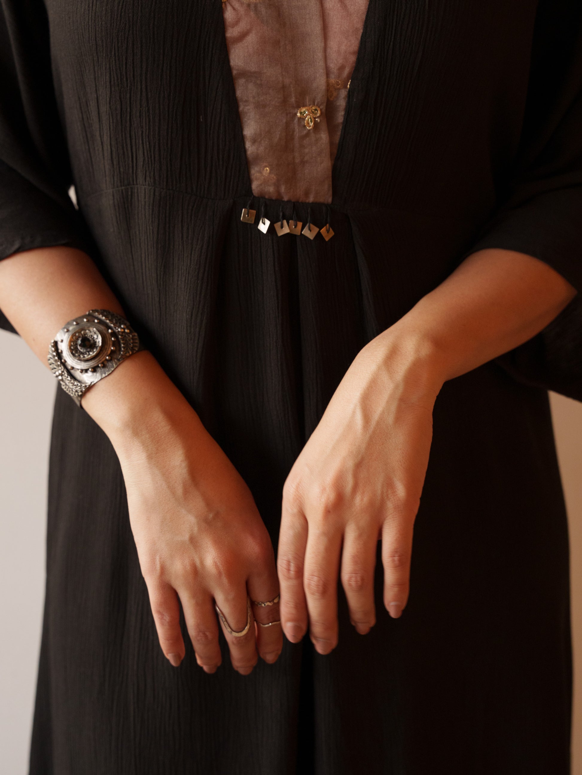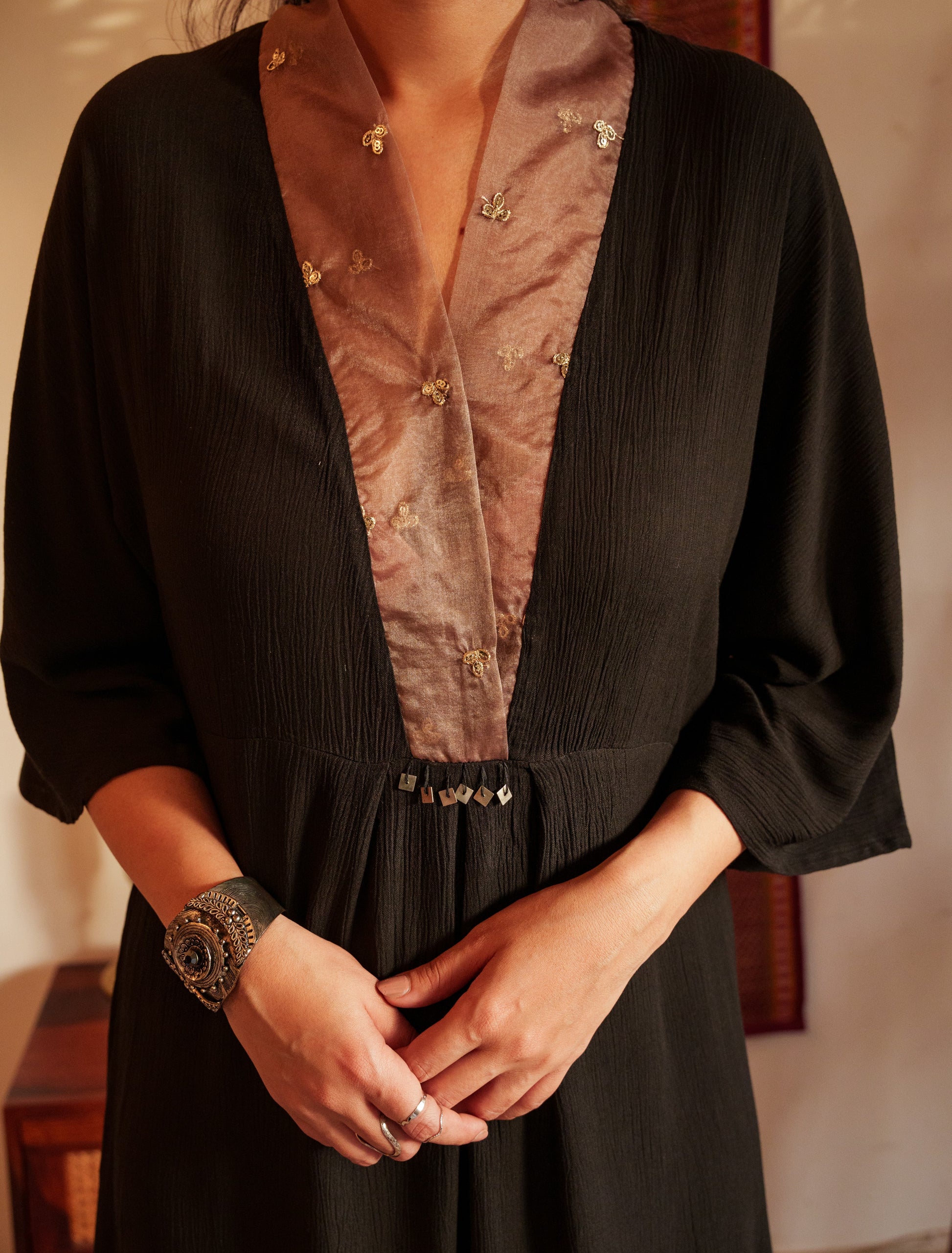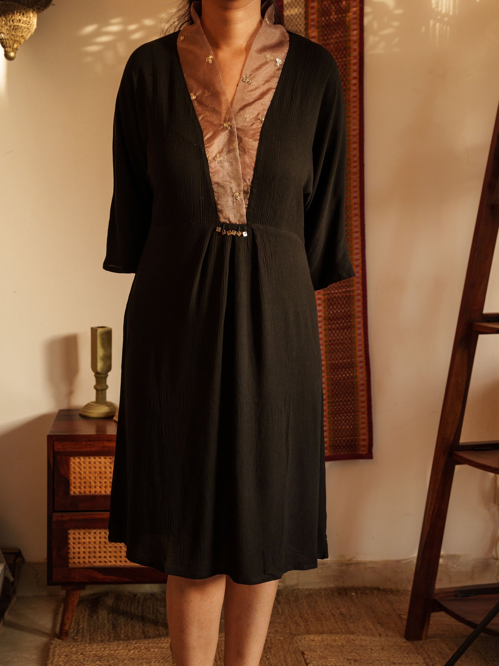 Details and Fit: This elegant black dress is a perfect fusion of sophistication and modern flair. The silhouette is graceful and gives a feminine shape. The highlight of the dress is the exquisite organza neckline. Subtle metallic hangings along the neckline shimmer and catch the light, offering a touch of luxurious sparkle without overpowering the overall elegance. The dress's clean, sleek lines are complemented by the fluidity of the organza, making it feel both structured and soft.