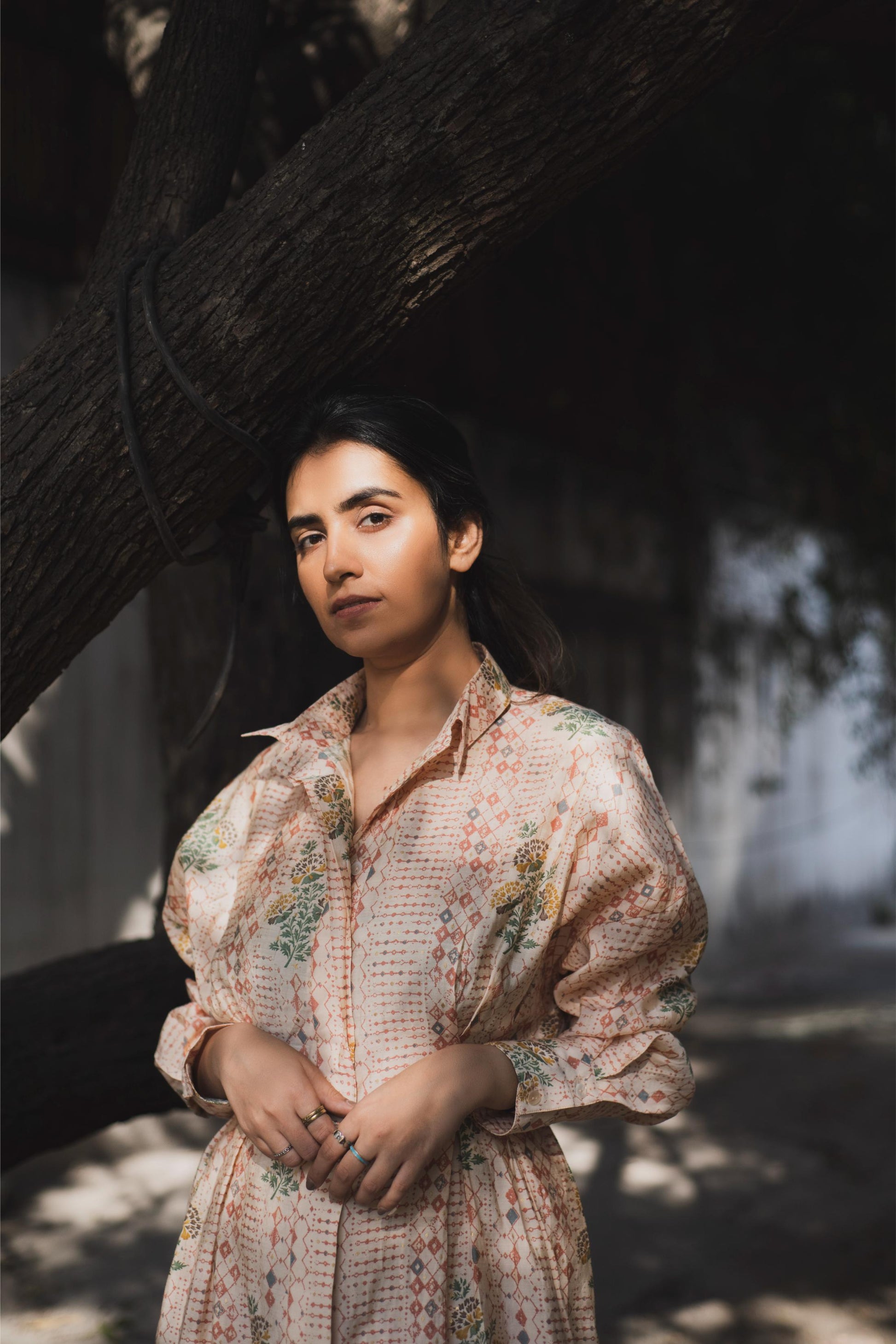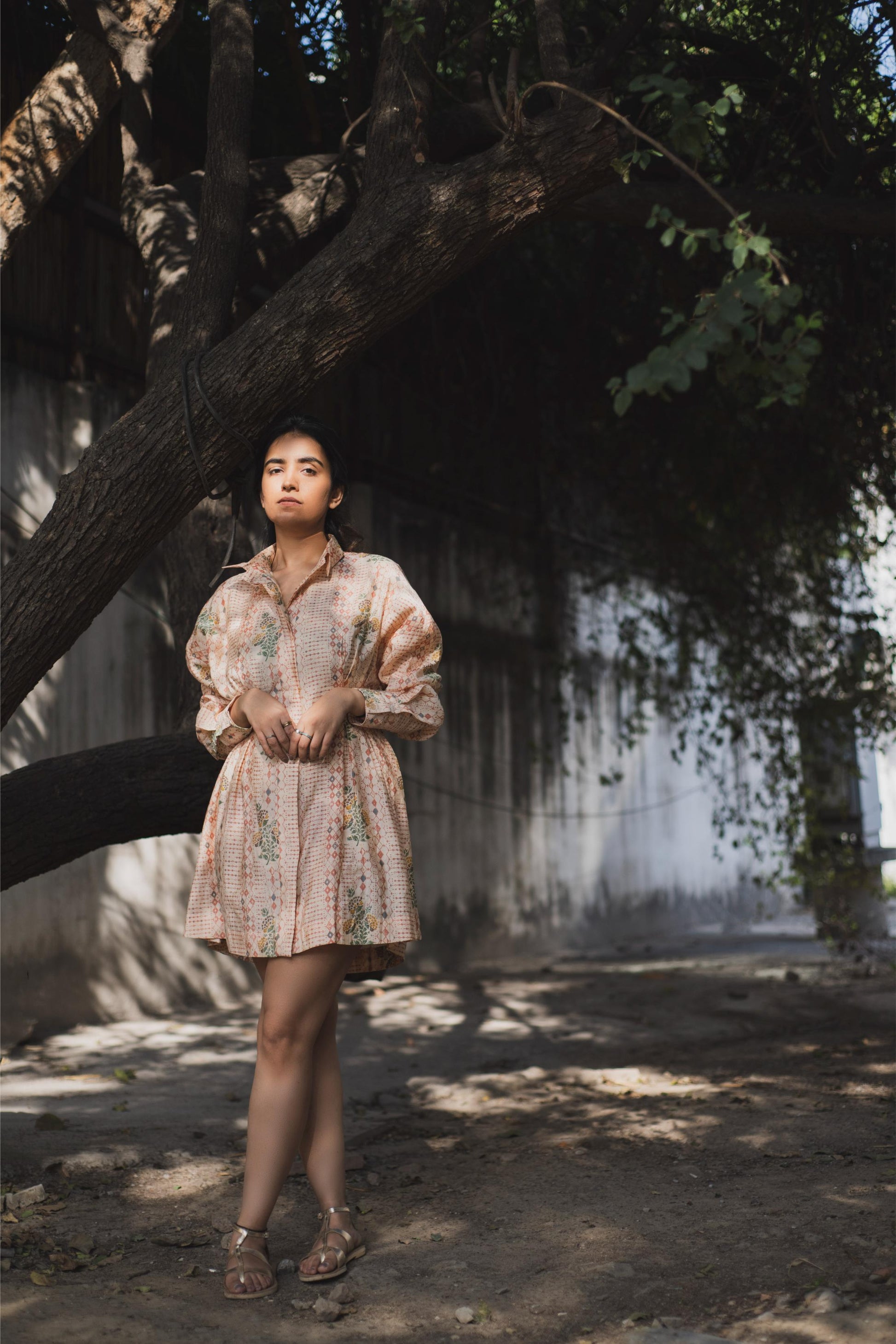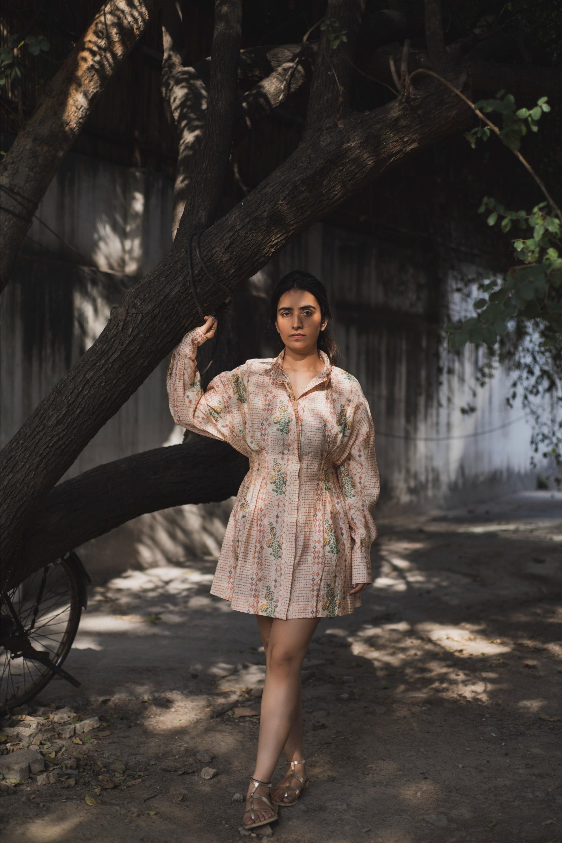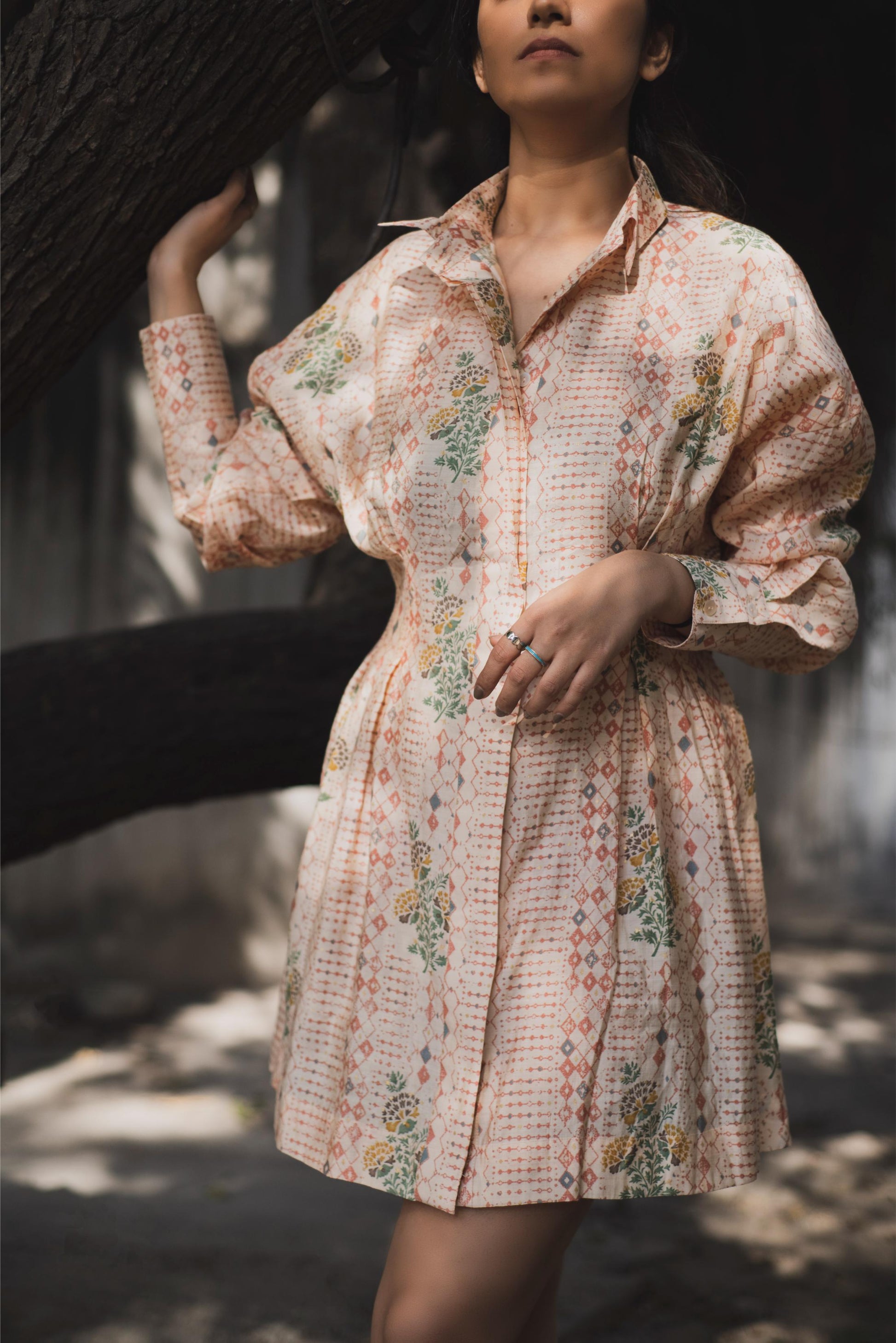 A unique silhouette can make your game, this cool bohemian print on a shirt dress with panels on the sleeves and neck makes e the fit classy and so uncommon. The pattern of the dress is very unique.