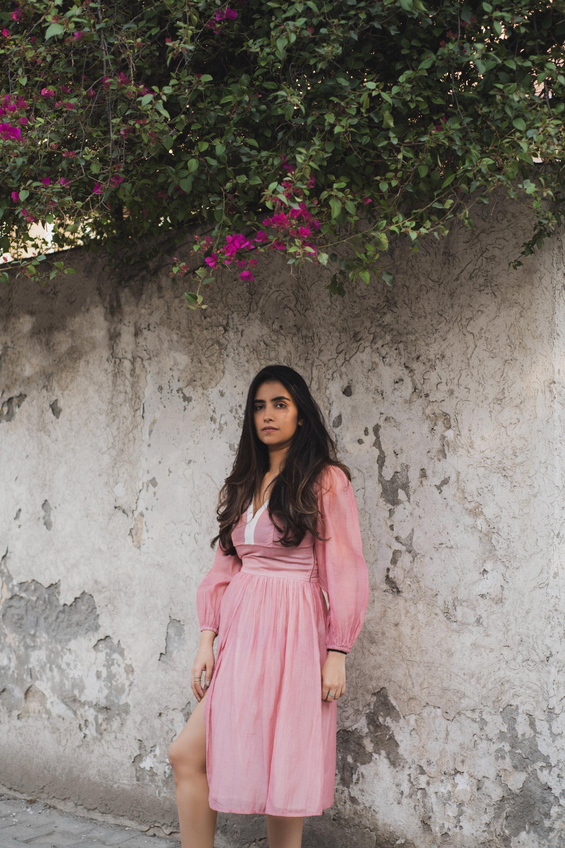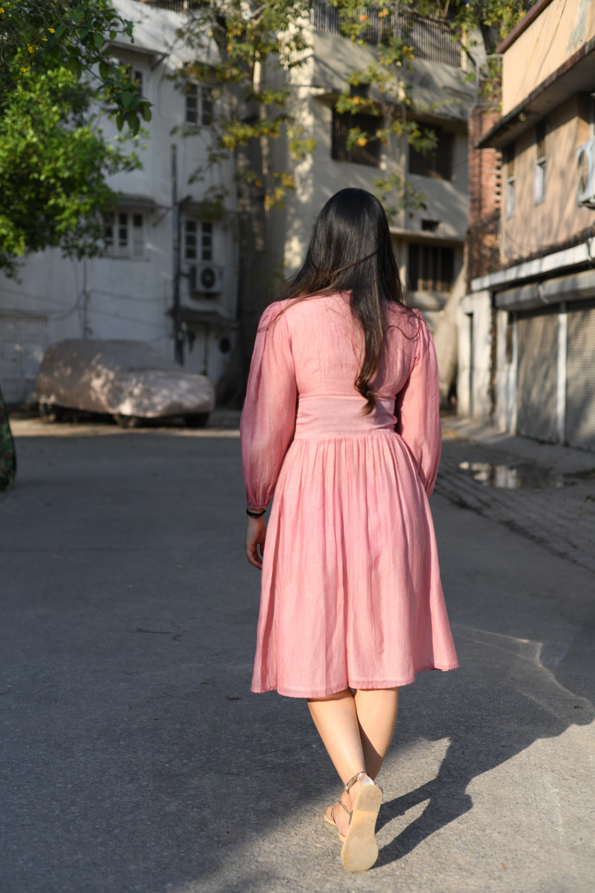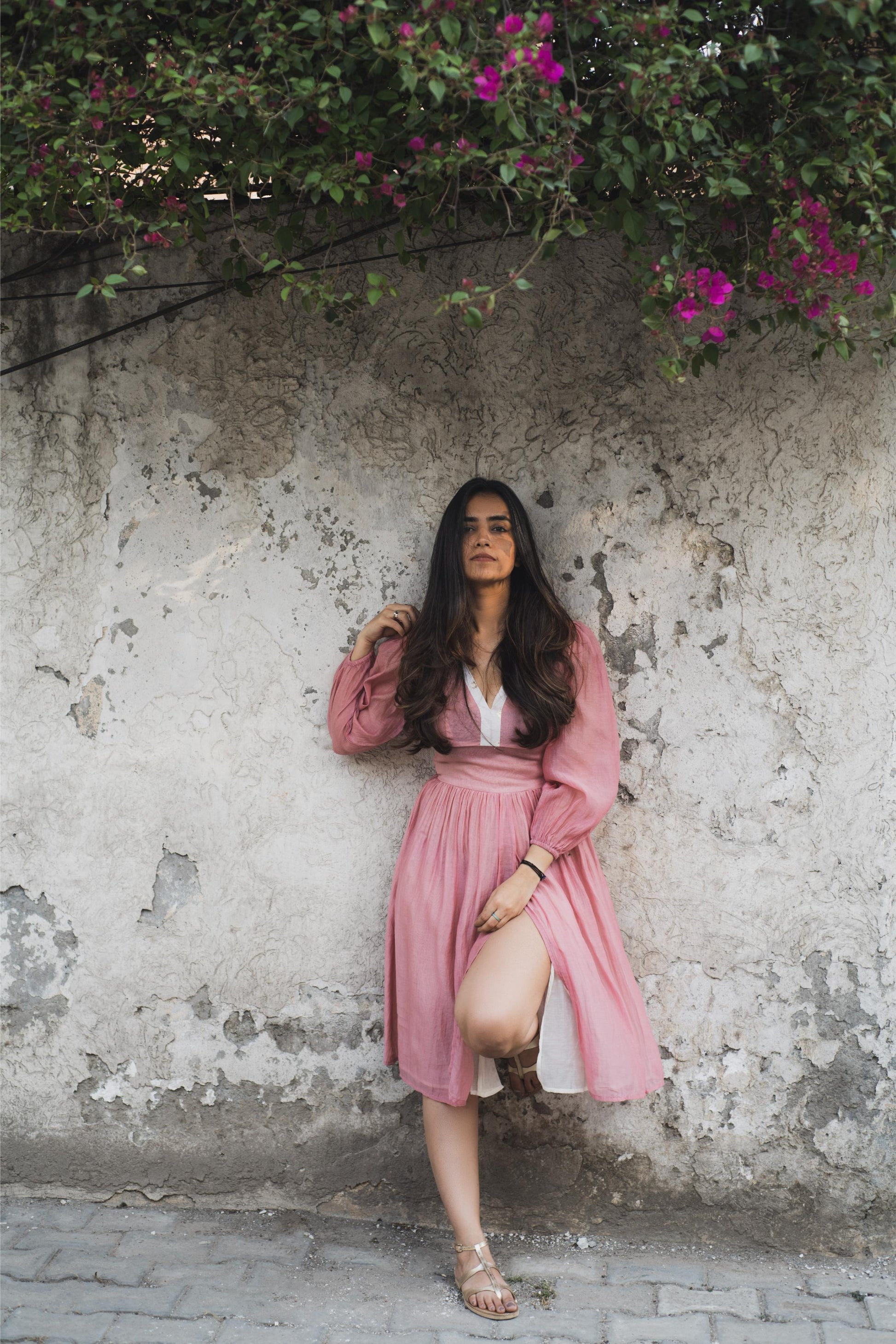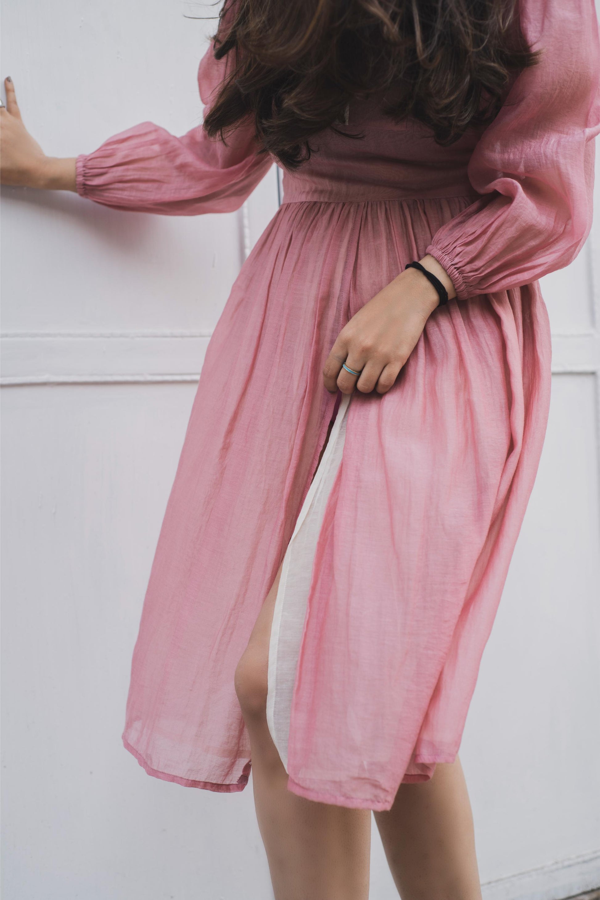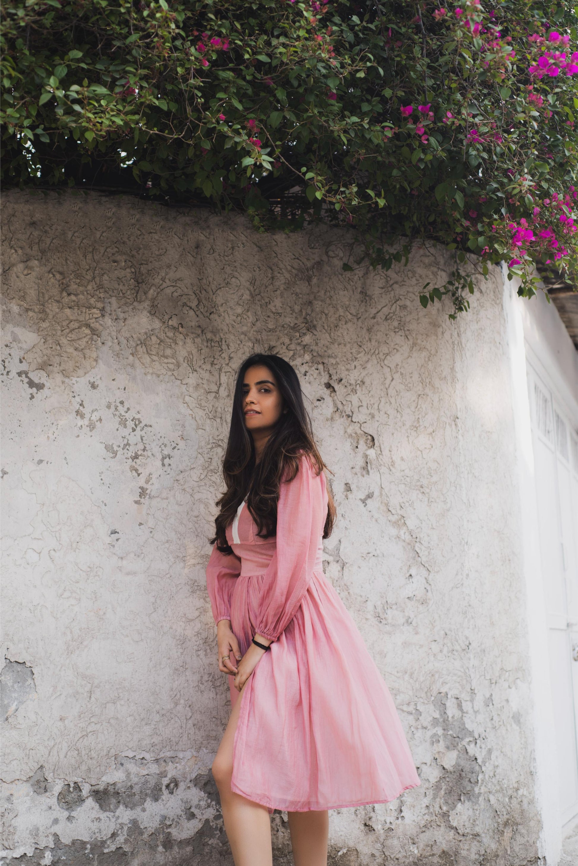 Perfect for a summer brunch, the dress has Benarasi brocade detailing on the neck, Hues of pink and white on pure Chanderi fabric makes the dress a dreamy affair!