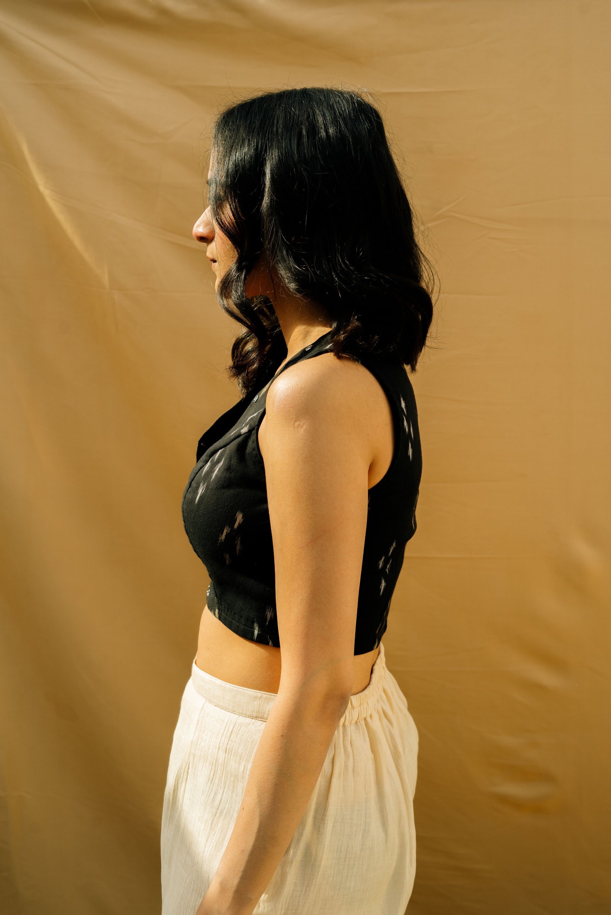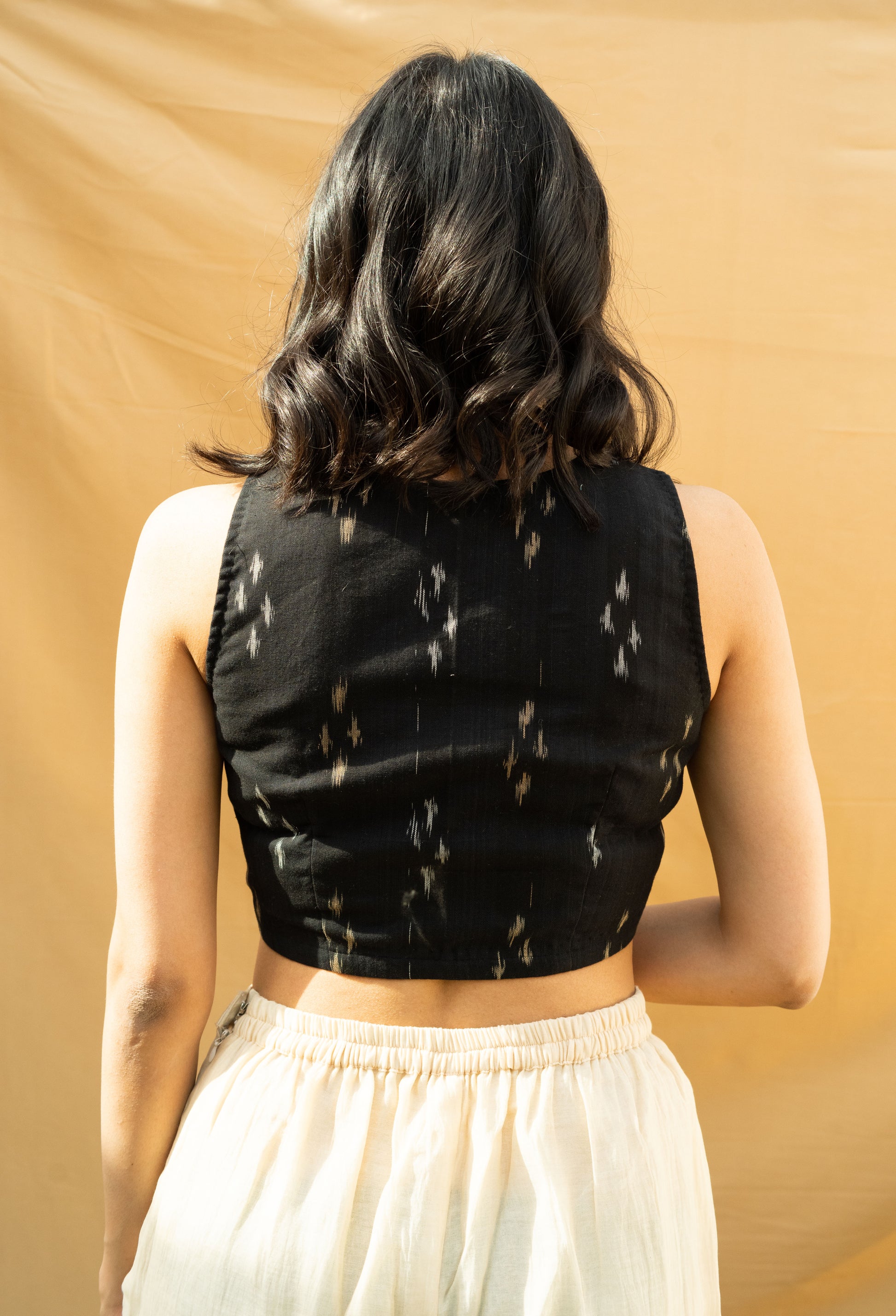 Black Jack will make you win the game. A Handloom ikat pattern with metallic tich buttons fusion is a must-have, designed to rock the denim, Coord, or cargo, giving it a gypsy feel.