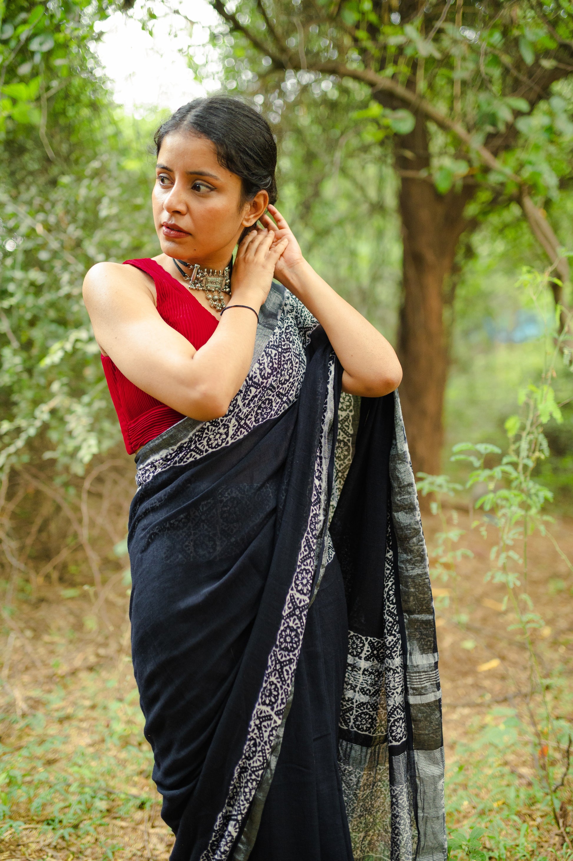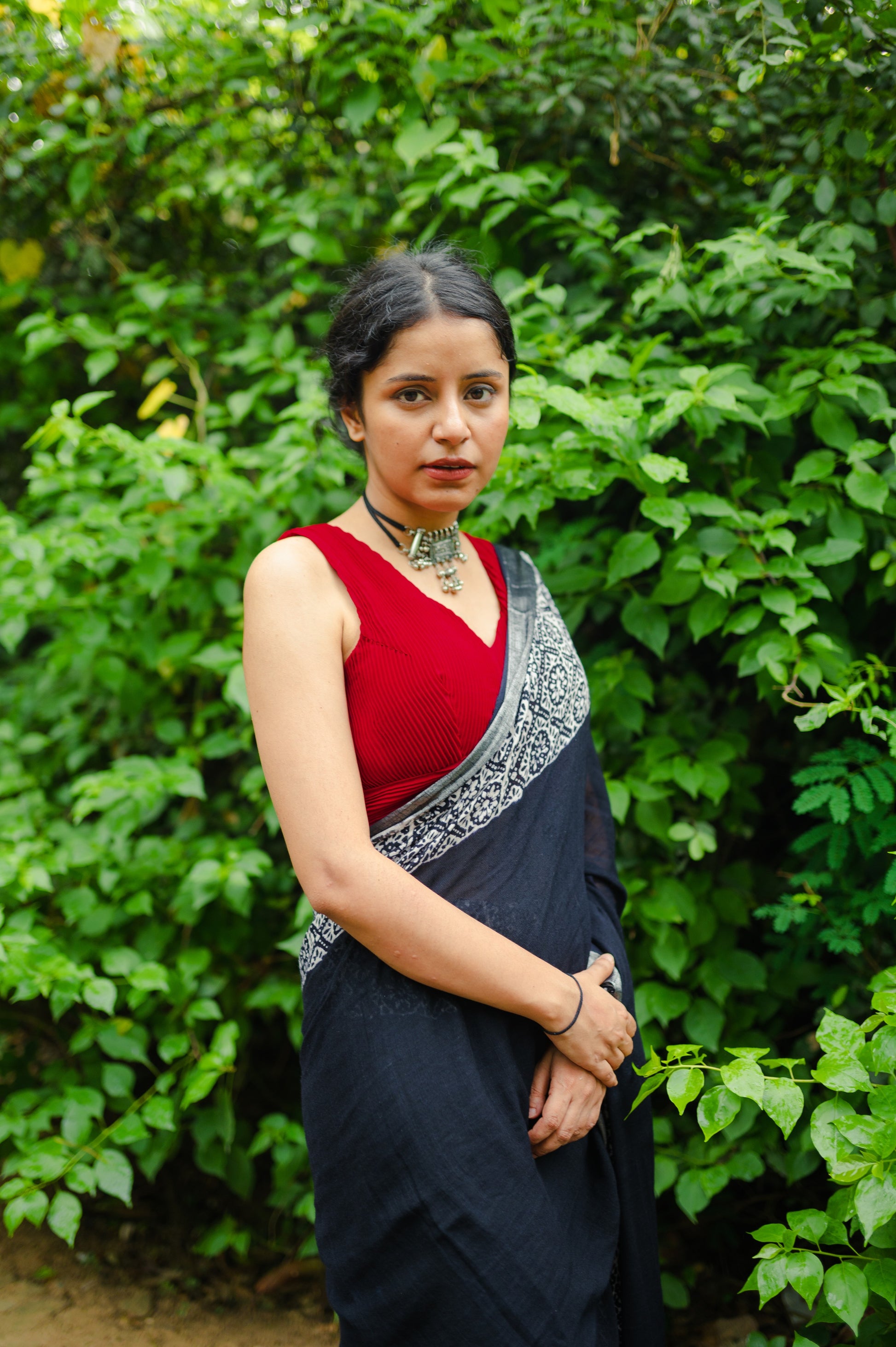The blouse is an all-time classic with a little twist, the folded lines pattern comes out as quirky and different. The vintage neckline adds a lot of grace when paired up with a saree or a blazer.