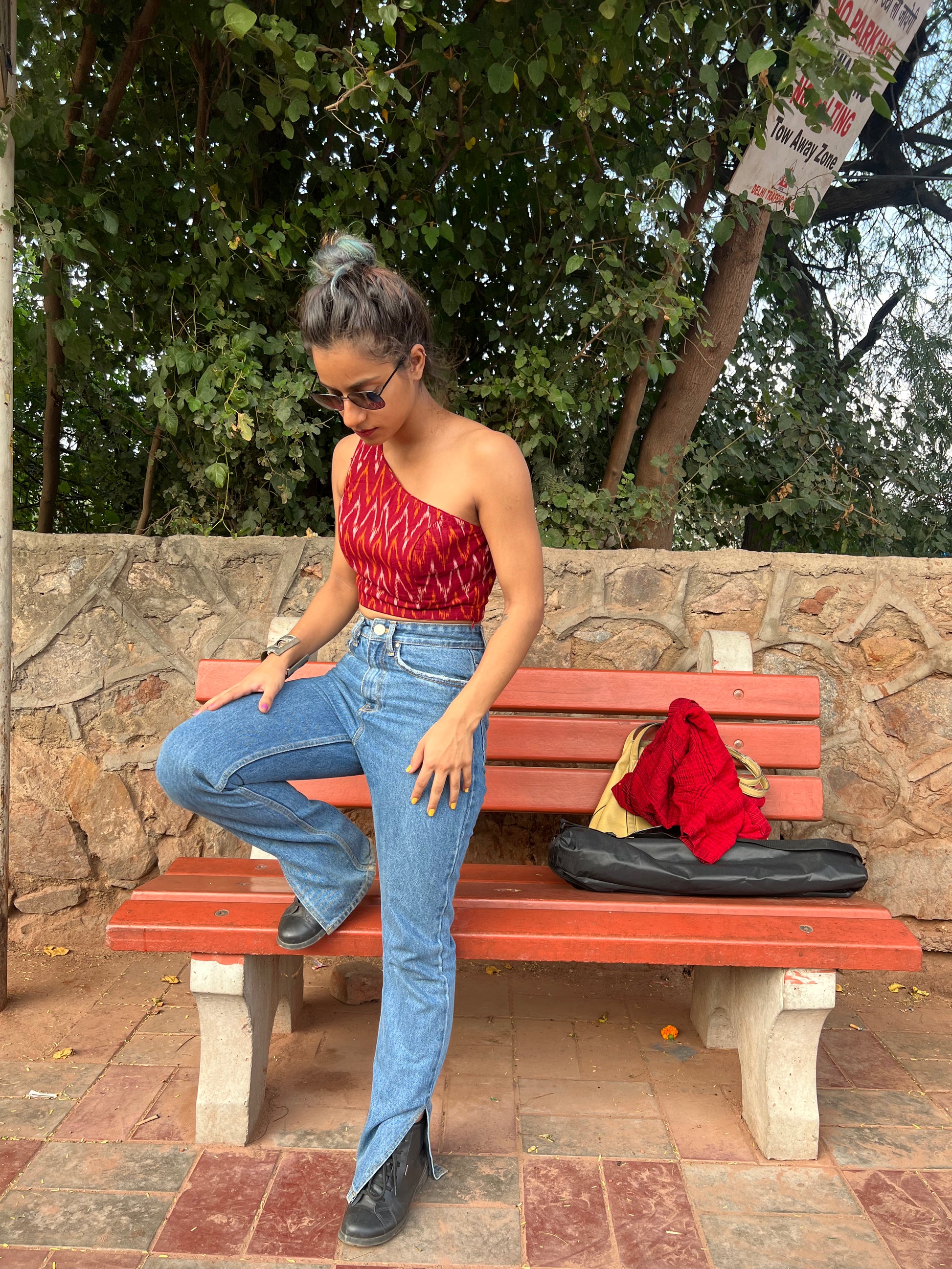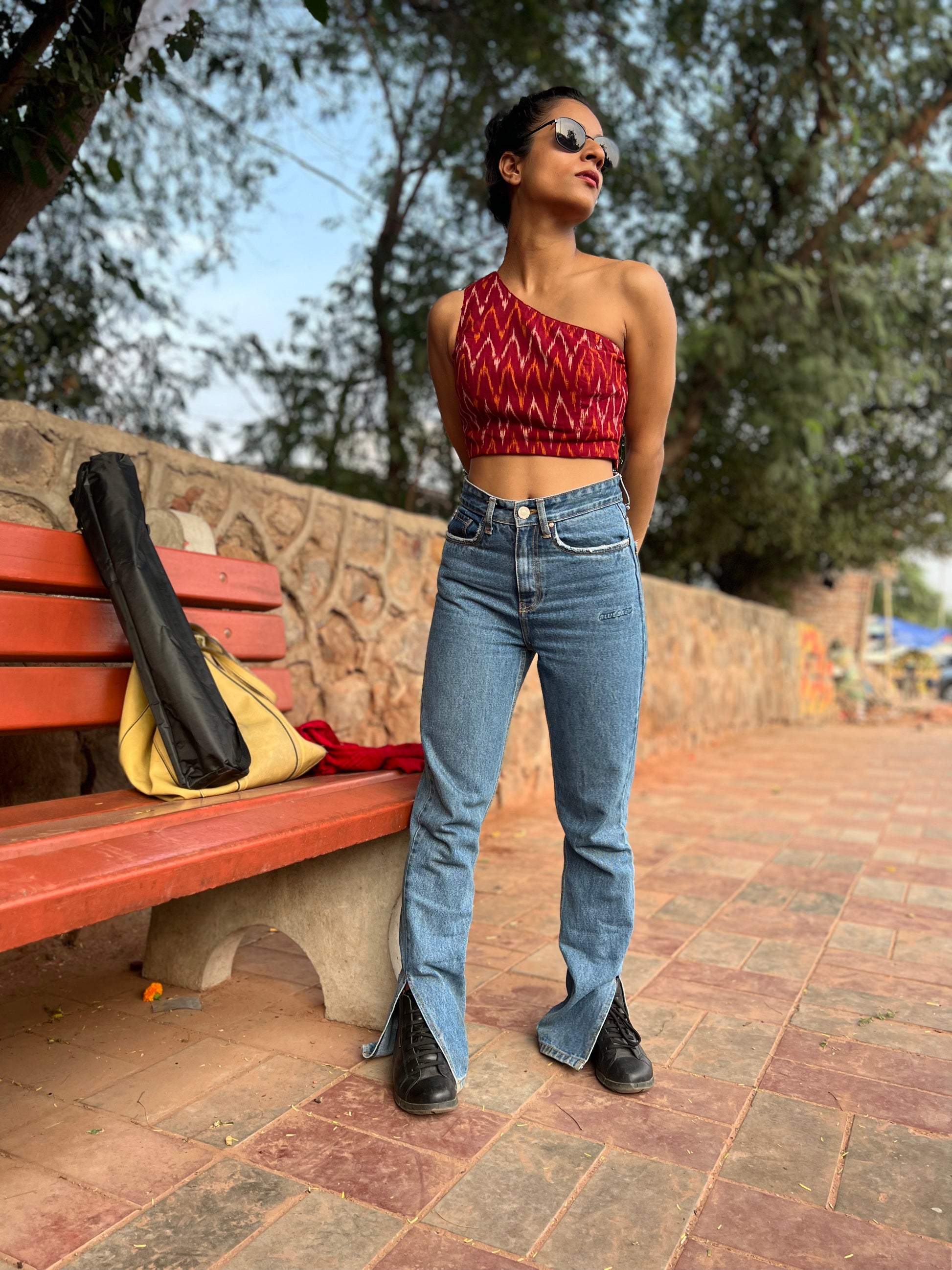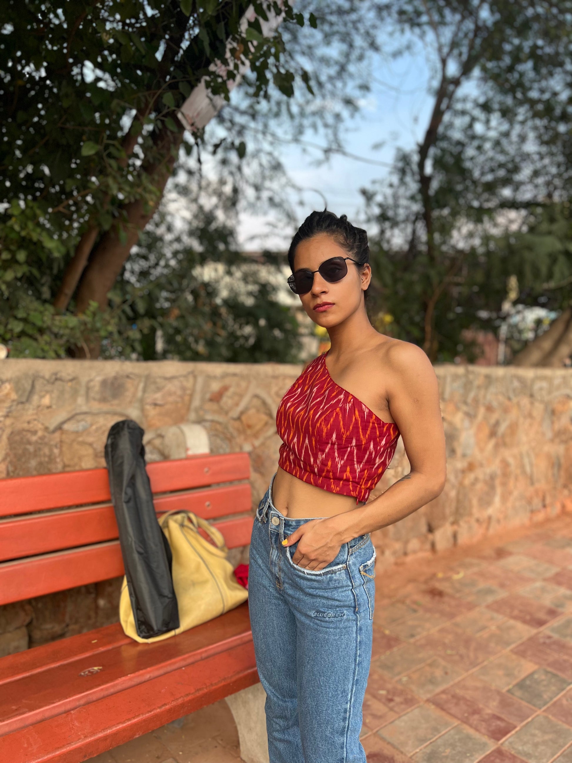 The rustic red ikat print is a bold statement piece to add to your wardrobe. You will look effortlessly cool and turn heads in this stylish one-shoulder style blouse.